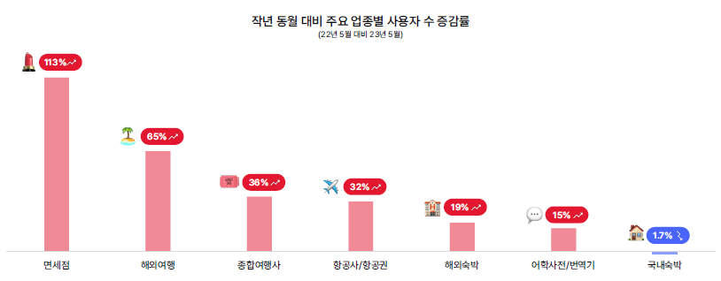 특히 올해는 여행 앱 사용자가 22년 대비 평균 40% 상승하였고 해외여행이 눈에띄에 상승한것을 볼 수 있습니다.